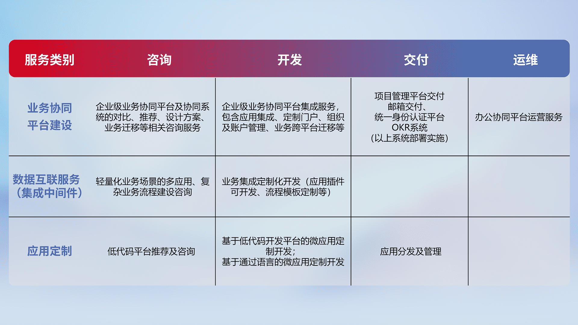 针对钉钉、、、企微、、、IDaas等平台级产品提供产品的规划、、、方案、、交付、、、定制化开发等服务,,,实现如统一协同办公、、智能客户服务、、、、混合会议管理、、、、智能数据查询、、、、等业务场景,,实现数字化转型。。。。