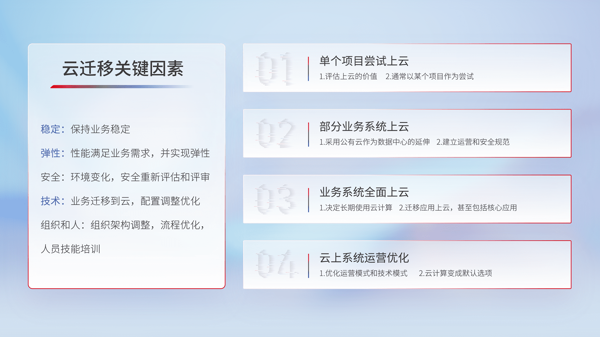 结合实际业务,,从规划设计、、云平台选型、、云原生改造、、、数据迁移、、、、集成交付,,,迁移全过程为客户识别最佳上云路径,,做好风险识别管理,,设计网络架构、、身份权限、、、、安全审计合规、、操作审计、、、日志审计、、、监控告警策略、、、多站点容灾设计等,,,对云上基础设施进行整体规划,,,,提升IT治理水平,,以满足弹性、、高可用、、高性能的需求。。。。