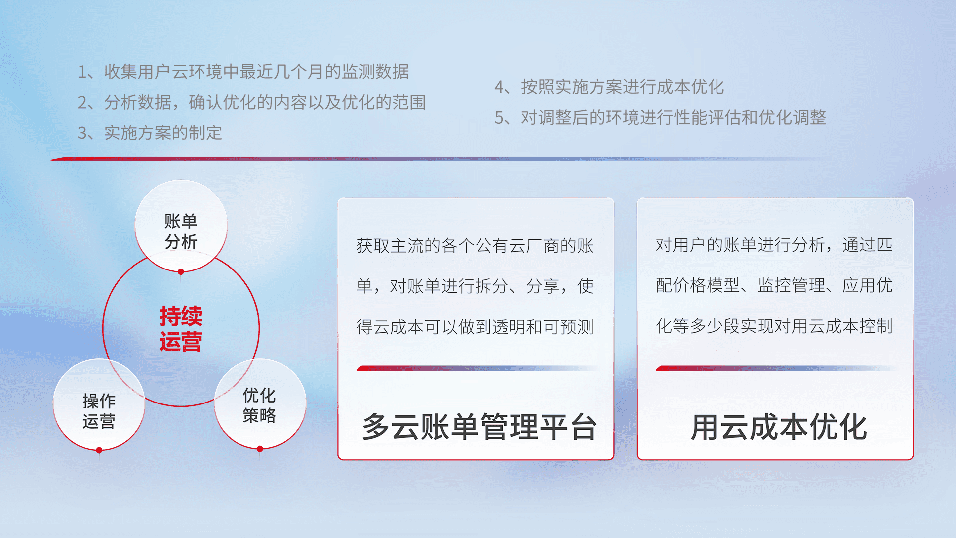 通过多云纳管,,,以统一的资源数据模型把客户的云资源进行抽象和封装,,,进而实现对多云资源的统一操作,,保障云资源管理的可靠性、、、稳定性与可用性。。量身定制化运维内容,,配置、、、开发运维、、、补丁管理、、备份、、、监控、、认证和访问管理、、、、审计和日常巡检等,,,,保障在用云过程中的可靠度,,,稳定度以及高可用率。。。