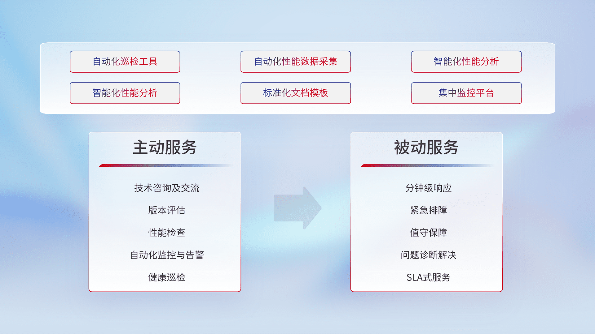 智能化工具和标准化文档,,,,保障服务质量,,,提供主动服务(包含技术咨询、、、版本评估、、性能检查、、、自动化监控与告警、、、健康巡检)和被动服务包含(分钟级响应、、紧急排障、、、、值守保障、、、、问题诊断解决、、、、SLA服务)。。。
